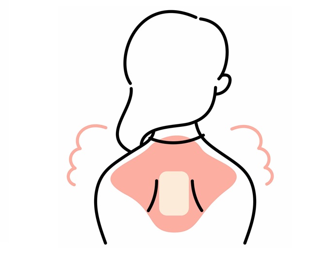 背中の肩甲骨と肩甲骨のちょうど真ん中に貼ると、熱が上着とインナーに挟まれて逃げにくく、背中全体が温まります。