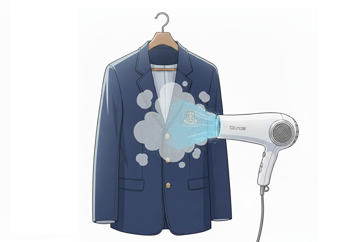 制服の生地(特にウール)は熱には強くないので、テカリや縮み・変色の原因になります。「冷風」か、せいぜい「低温の風」を使いましょう。